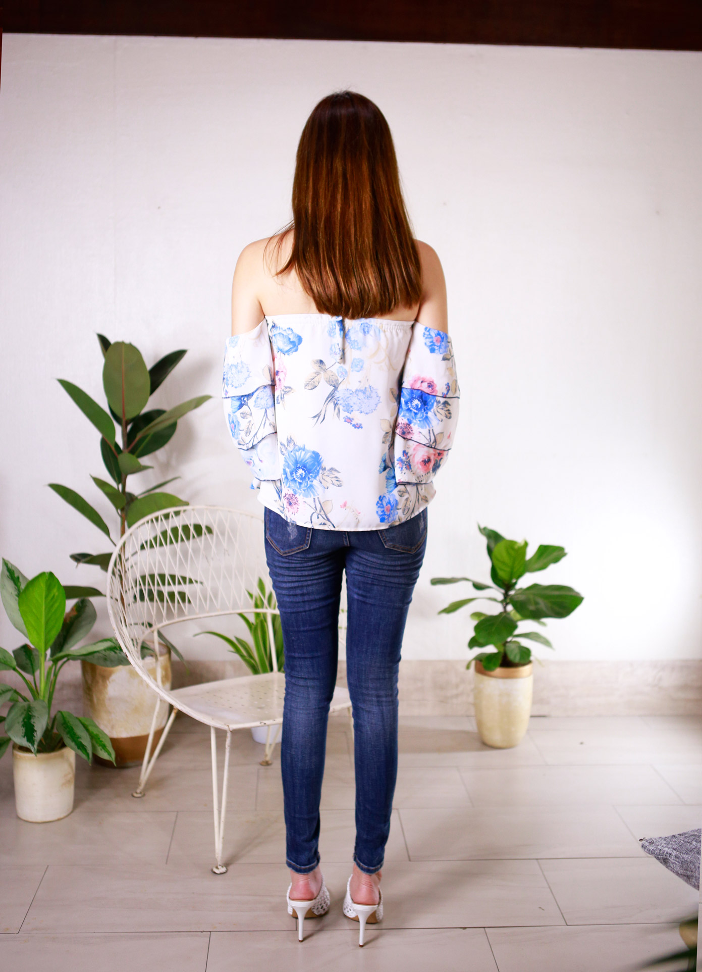 Off shoulder top with tie ribbon on neck and ruffles on sleeves